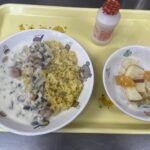 今日は誕生日会で、キノコソースかけライスと、フルーツサラダ🥗、乳酸菌飲料でした。